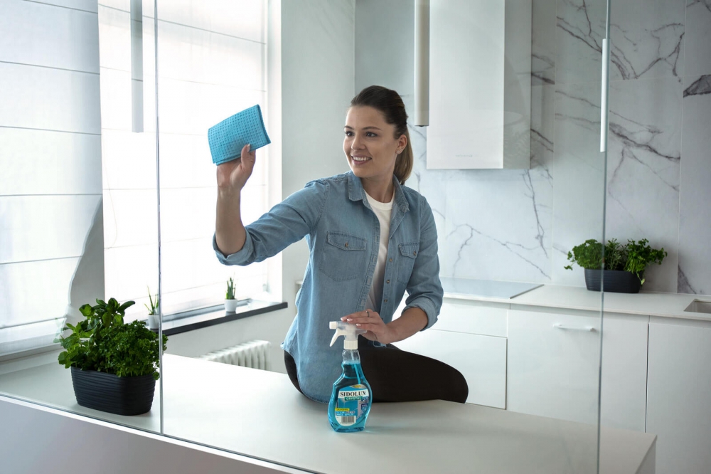 Photographs showing a person in the frame are particularly effective in promoting everyday-use products. Thanks to them, viewers can more easily identify with the situations shown in the images. In the case of detergents or cleaning products, a model can emphasize comfort of use, the homely atmosphere of the scene, and the practical aspects of the product.
